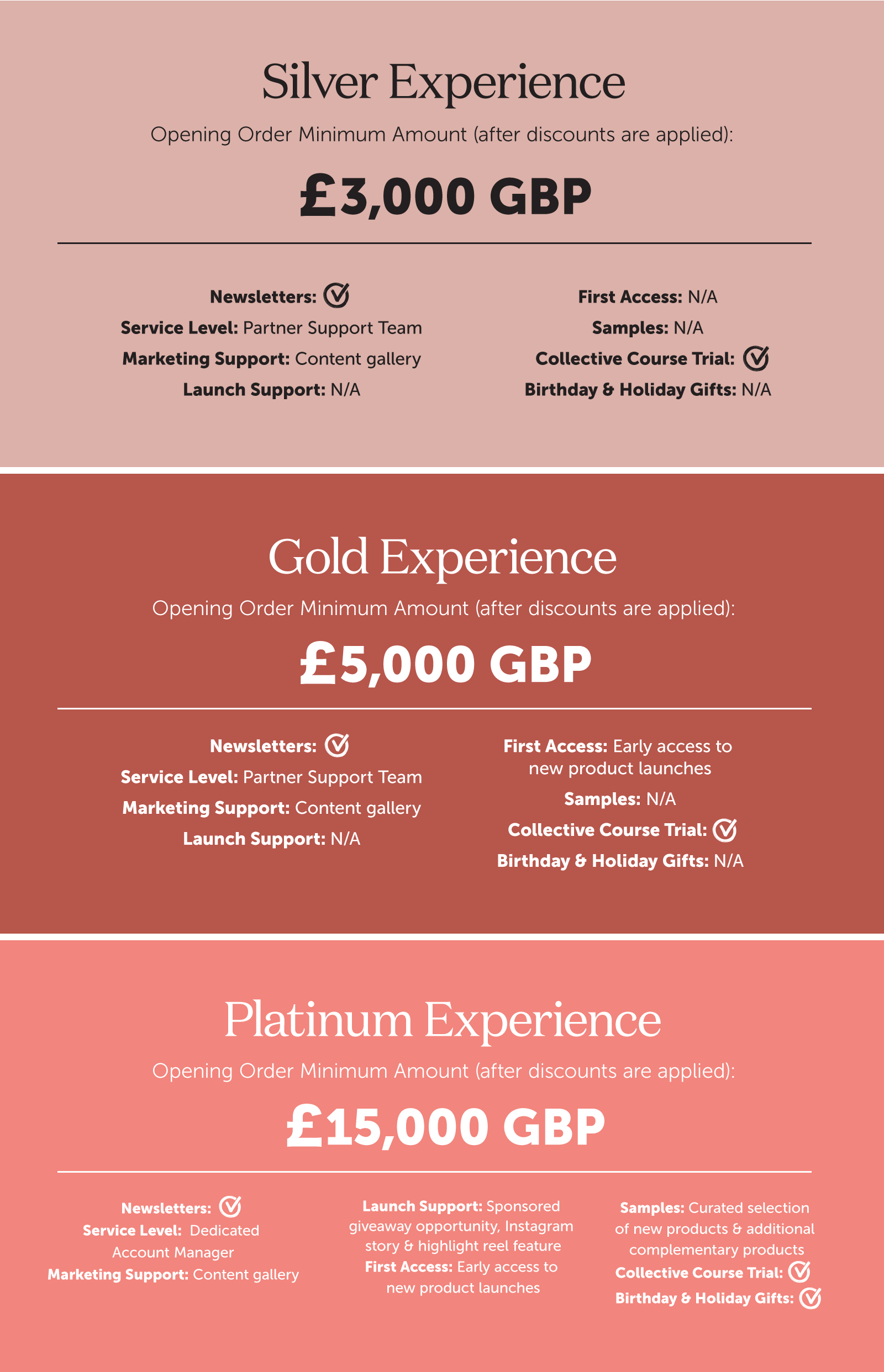 Our Partnerships team will provide you with your perks & benefits accordingly via email. If you qualify for our Platinum tier, your dedicated account manager will reach out with more details.