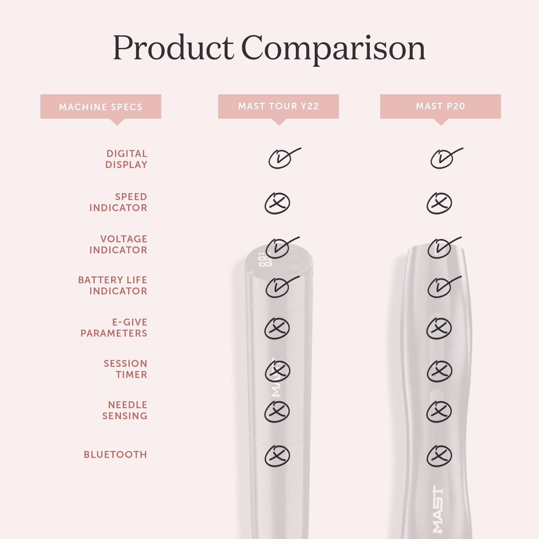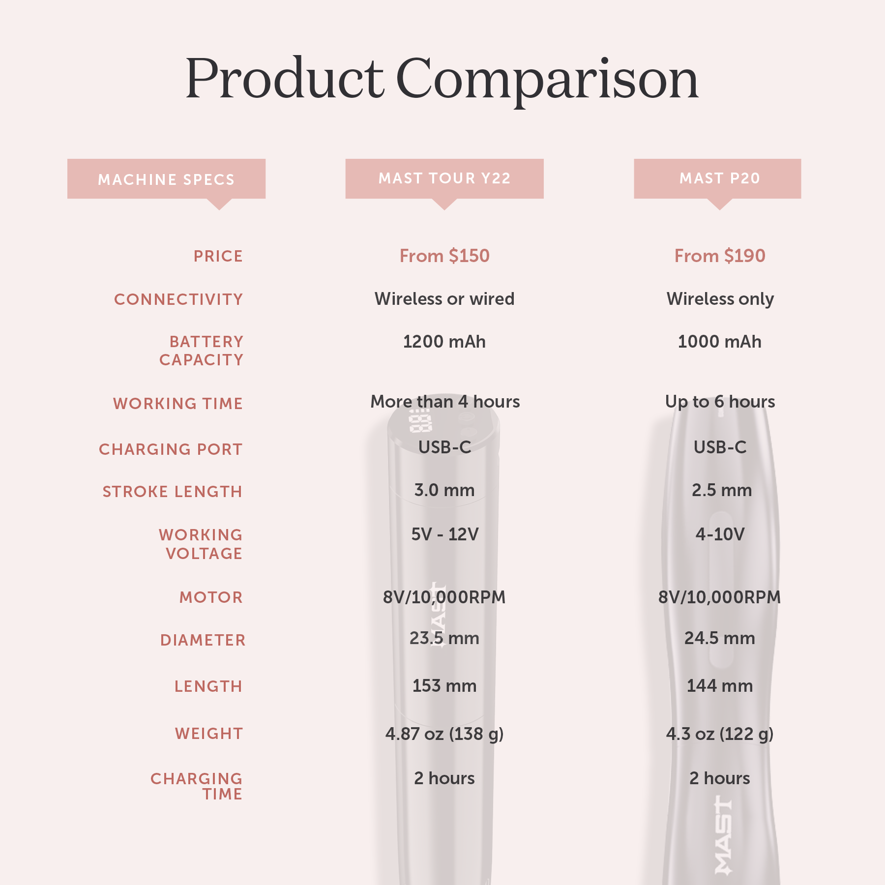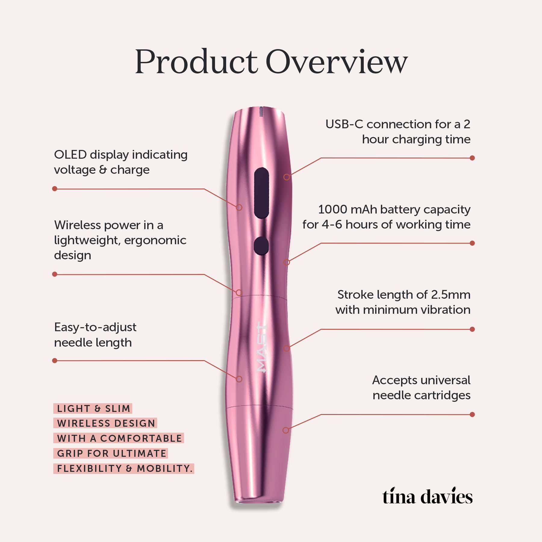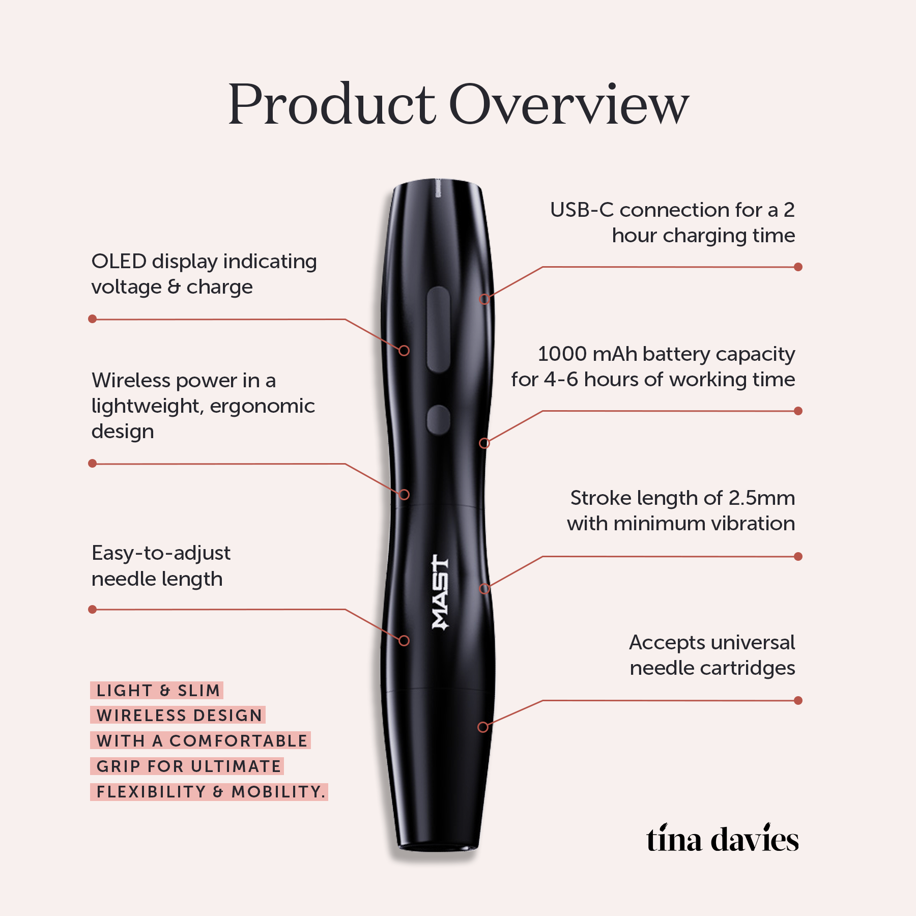 We bring to you the Mast P20, curated by Tina Davies for comfort, performance, and value. Whether beginner or seasoned, this lightweight, wireless machine is a perfect fit in every artist’s hand. Features a light & slim design with even better ergonomics making it easier to operate while its uniquely rounded silhouette and quiet-running motor provide absolute comfort while you work.
