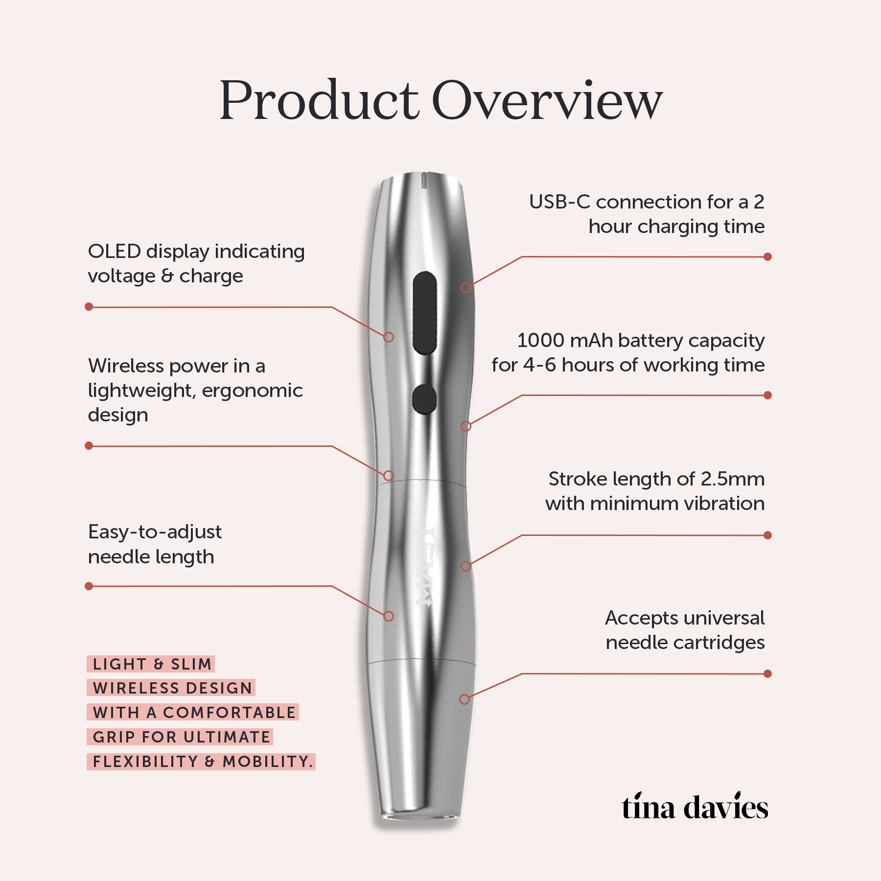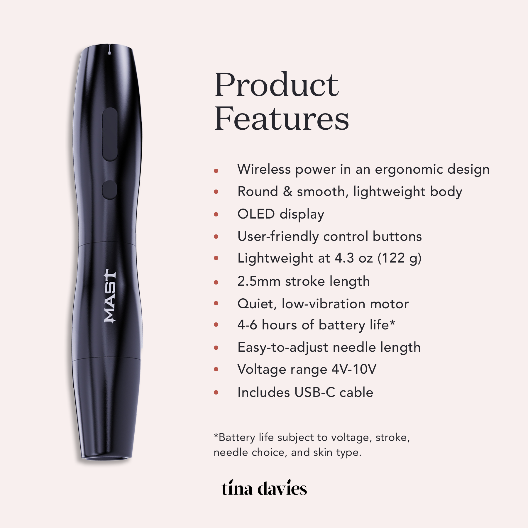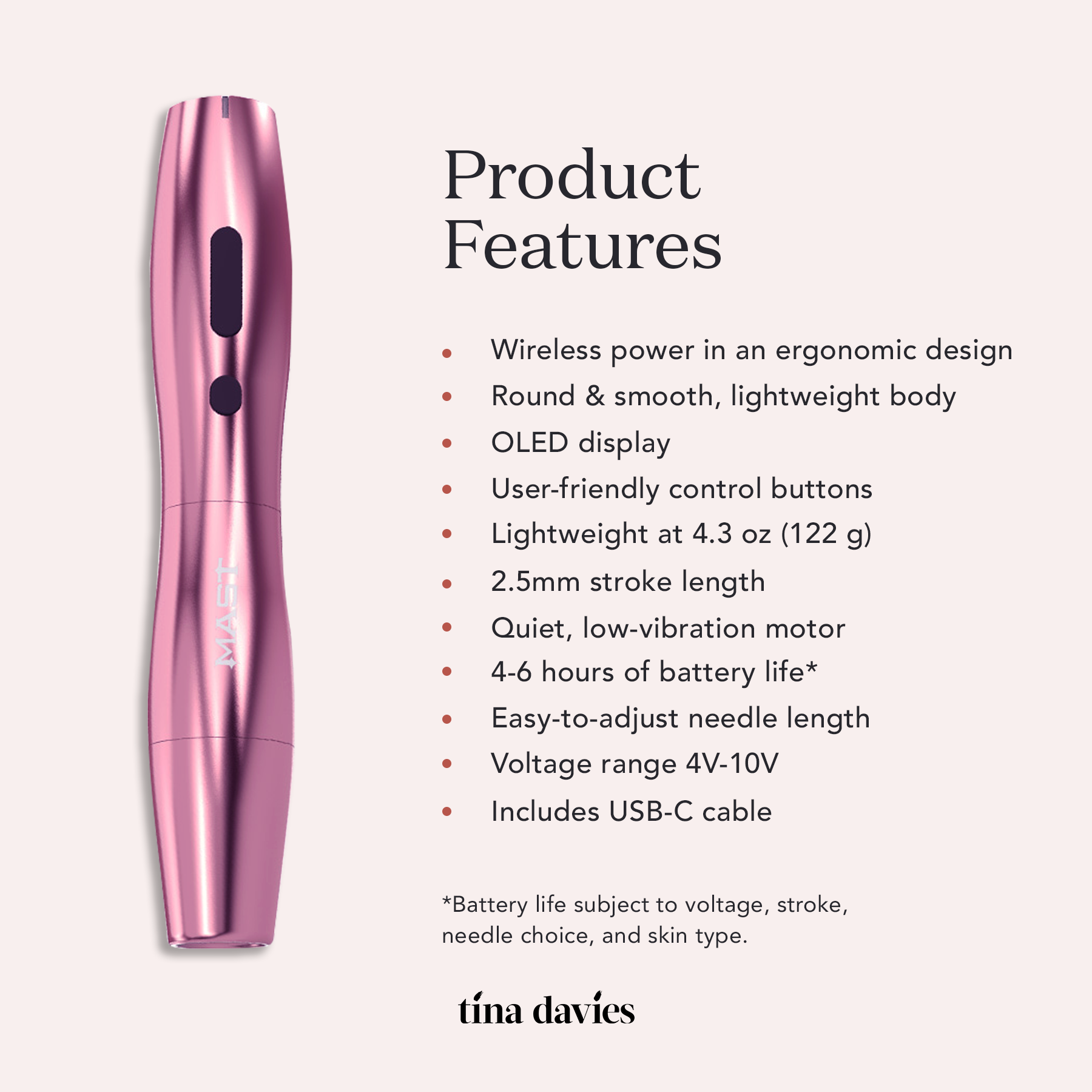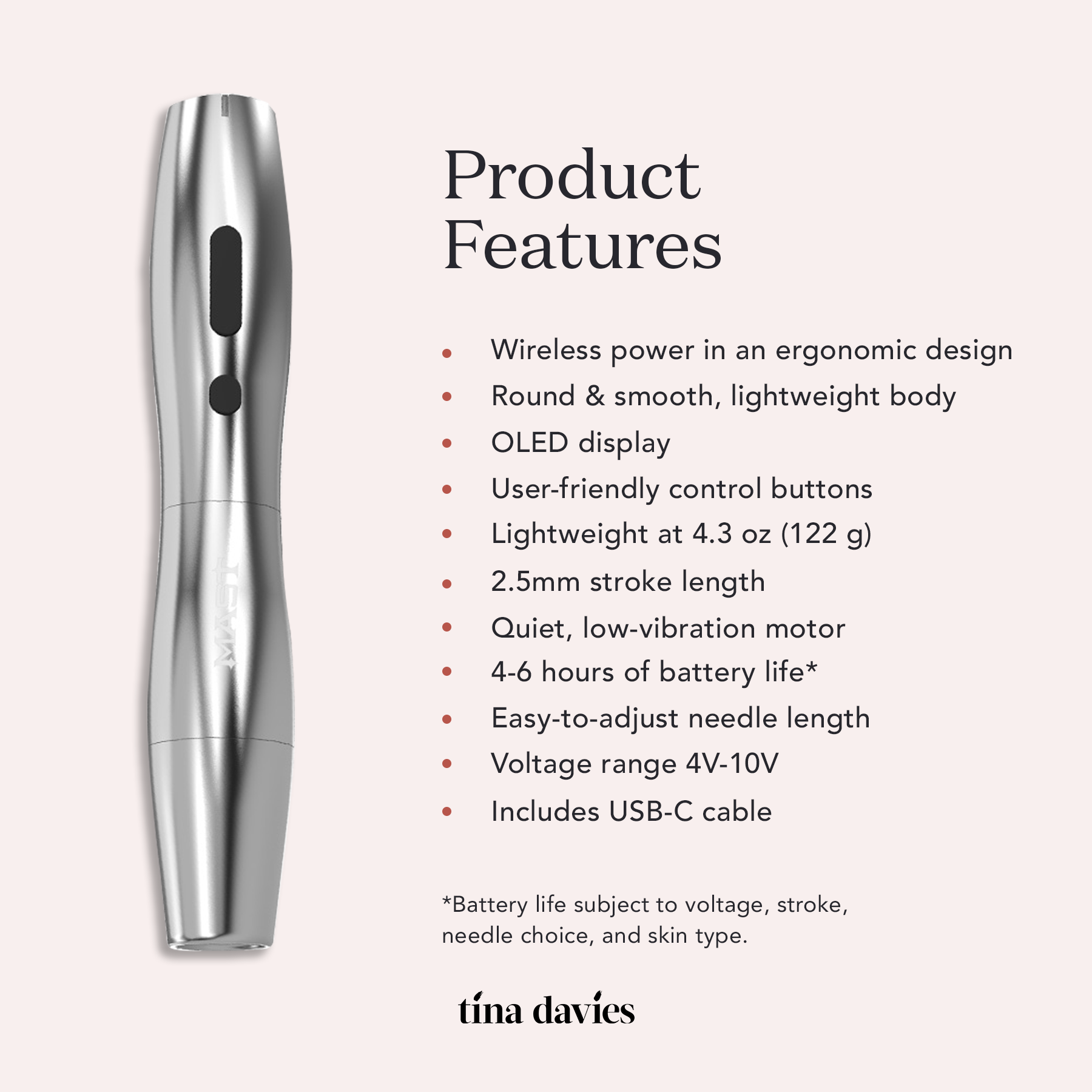 *USB-C charging block not included. Wireless only – cannot be used with a power supply. Unscrew the battery from the lower body to reveal the USB-C charging port. Battery life is subject to voltage, stroke, needle choice, and skin type.